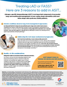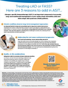 References: 1. Marsella R, De Benedetto A. Atopic dermatitis in animals and people: an update and comparative review. Vet Sci. 2017;4(3):37. doi:10.3390/vetsci4030037 2. Miller J, Simpson A, Bloom P, et al. 2023 AAHA management of allergic skin diseases in dogs and cats guidelines. J Am Anim Hosp Assoc. 2023;59(6):255-284. doi:10.5326/JAAHA-MS-7396 3. Ramió-Lluch L, Brazís P, Ferrer L, Puigdemont A. Allergen-specific immunotherapy in dogs with atopic dermatitis: is owner compliance the main success-limiting factor? Vet Rec. 2020;187(12):493. doi:10.1136/vr.106024 4. Olivry T, DeBoer DJ, Favrot C, et al. Treatment of canine atopic dermatitis: 2015 updated guidelines from the International Committee on Allergic Diseases of Animals (ICADA). BMC Vet Res. 2015;11:210. doi:10.1186/s12917-015-0514-6 5. Arcique MA, Bajwa J. Atopic dermatitis in humans and dogs. Can Vet J. 2020;61(1):82-84. 6. Drechsler Y, Dong C, Clark DE, Kaur G. Canine atopic dermatitis: prevalence, impact, and management strategies. Vet Med (Auckl). 2024;15:15-29. doi:10.2147/VMRR.S412570 7. Mueller RS. A systematic review of allergen immunotherapy, a successful therapy for canine atopic dermatitis and feline atopic skin syndrome. J Am Vet Med Assoc. 2023;261(S1):S30-S35. doi:10.2460/javma.22.12.0576 8. Marsella R. Atopic dermatitis in domestic animals: what our current understanding is and how this applies to clinical practice. Vet Sci. 2021;8(7):124. doi:10.3390/vetsci8070124 9. Shida M, Kadoya M, Park SJ, Nishifuji K, Momoi Y, Iwasaki T. Allergen-specific immunotherapy induces Th1 shift in dogs with atopic dermatitis. Vet Immunol Immunopathol. 2004;102(1-2):19-31. doi:10.1016/j.vetimm.2004.06.003 10. Veneziani I, Landolina N, Ricci B, Rossi O, Moretta L, Maggi E. How the immune system responds to allergy immunotherapy. Biomedicines. 2022;10(11):2825. doi:10.3390/biomedicines10112825 11. Akdis CA, Akdis M. Mechanisms of allergen-specific immunotherapy and immune tolerance to allergens. World Allergy Organ J. 2015;8:17. doi:10.1186/s40413-015-0063-2 12. Kotnik T. Quality of life of allergic dogs treated with allergen-specific immunotherapy—a retrospective study. Vet Sci. 2023;10(2):72. doi:10.3390/vetsci10020072 13. Zur G, White SD, Ihrke PJ, Kass PH, Toebe N. Canine atopic dermatitis: a retrospective study of 169 cases examined at the University of California, Davis, 1992-1998. Part II. Response to hyposensitization. Vet Dermatol. 2002;13(2):103-111. doi:10.1046/j.1365-3164.2002.00286.x 14. Park S, Ohya F, Yamashita K, Nishifuji K, Iwasaki T. Comparison of response to immunotherapy by intradermal skin test and antigen-specific IgE in canine atopy. J Vet Med Sci. 2000;62(9):983-988. doi:10.1292/jvms.62.983 15. Jackson HA. Food allergy in dogs and cats; current perspectives on etiology, diagnosis, and management. J Am Vet Med Assoc. 2023;261(S1):S23-S29. doi:10.2460/javma.22.12.0548 16. Fennis EEM, van Damme CMM, Schlotter YM, et al. Efficacy of subcutaneous allergen immunotherapy in atopic dogs: a retrospective study of 664 cases. Vet Dermatol. 2022;33(4):321-e75. doi:10.1111/vde.13075 17. Outerbridge CA, Jordan TJM. Current knowledge on canine atopic dermatitis: pathogenesis and treatment. Adv Small Anim Care. 2021;2:101-115. doi:10.1016/j.yasa.2021.07.004